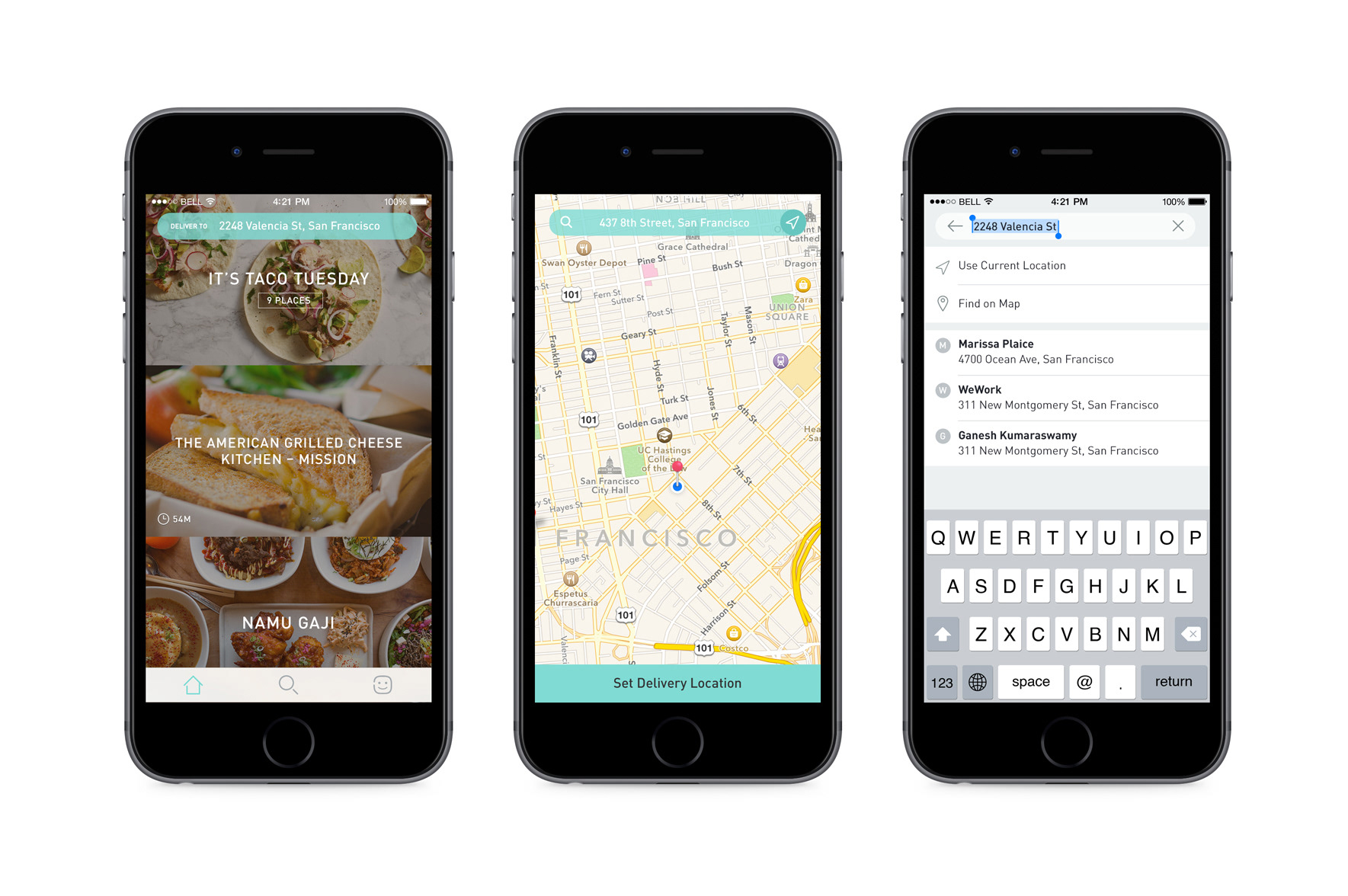 We brought delivery address front and center. A large map view is exposed when a user taps the delivery address field, so that if you're sitting at the park, you'd be able to point your exact location as a delivery spot.