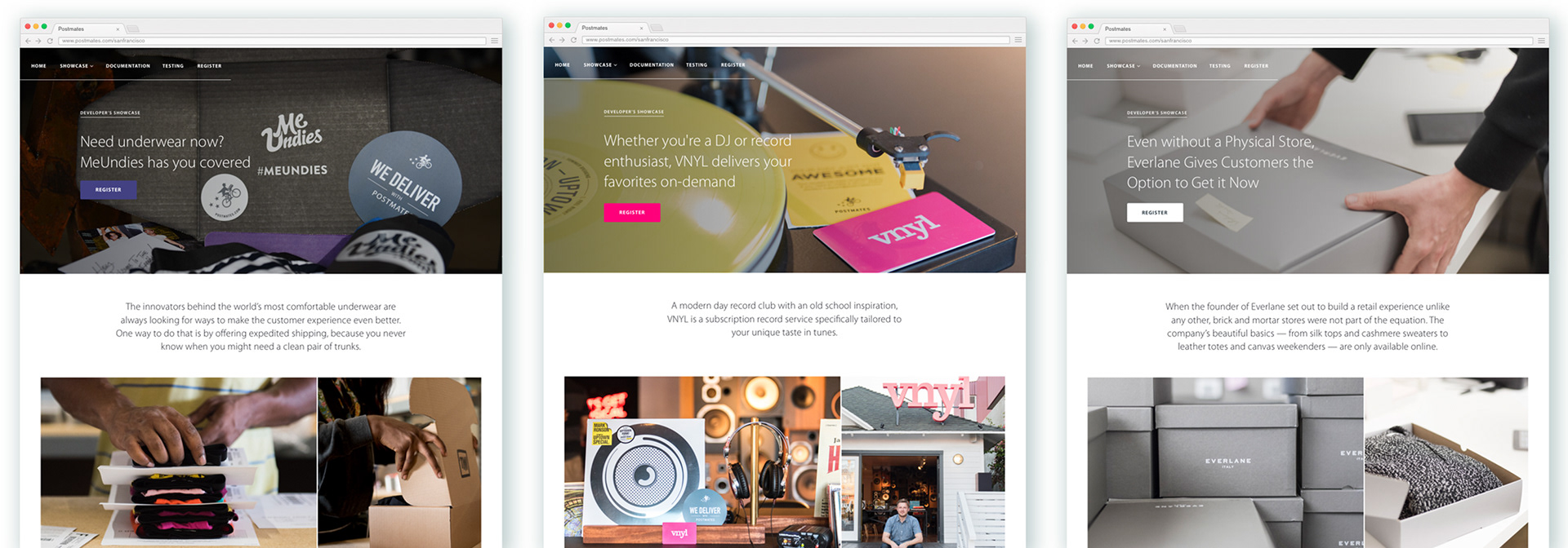 We created a marketing site in order to drive more volume to the company and the ability to touch other market areas who's never heard of Postmates before. Once logged in, developers can obtain documentation, API Keys and run mock deliveries to test the integration.