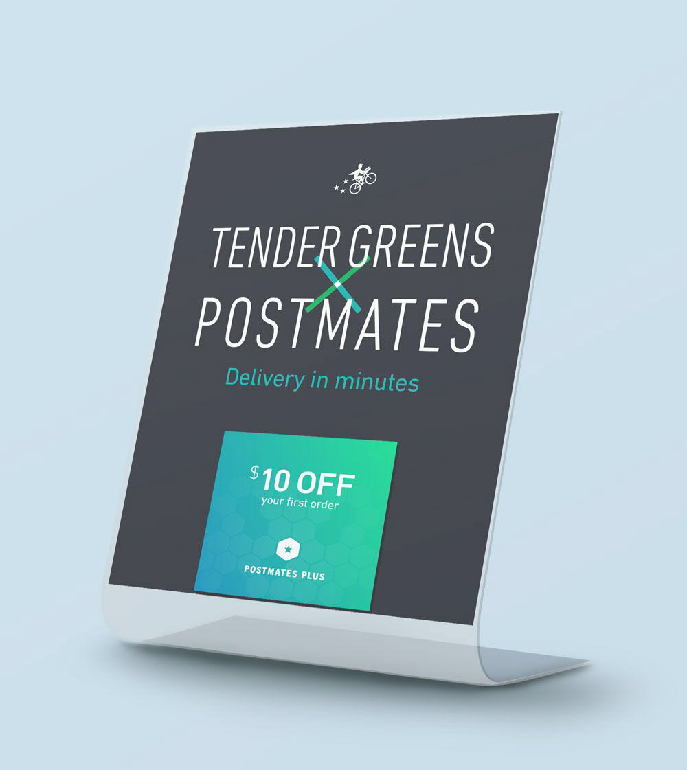 To promote merchant partnerships, Postmates created a kit that included window clings, t-shirts, and promotional items.